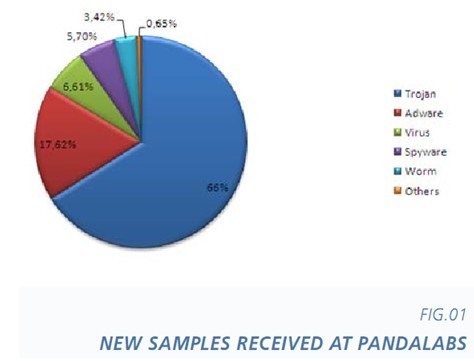 目前,熊猫实验室已经识别出4000多个恶意软件样本,平均每天识别55,000个新样本。2009年,木马病毒是 主要的新增病毒,其比例高达66%。