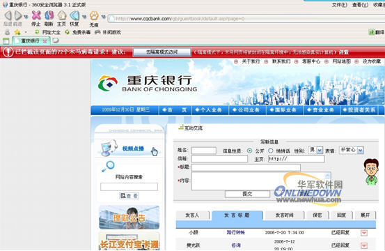 12月30日,安全中心发布安全播报,发现重庆银行官网正在被************,并且已持续多日。恶意网页监控数据显示,截至发稿前,重庆银行官网“用户留言区”页面的恶意代码仍未去除,可能会危及该行储户的上网安全。