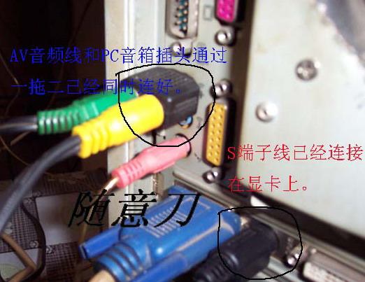 当然,只有图像,没有声音也是不爽的。找出随机附带的音频连接线,将一头连接到声卡的音频输出端口(Audio out),另一端接到电视机相应的音频输入端口,即大功告成。不过这样要用电脑的时候是很麻烦的,所以可以去买一个3.5一分二的转接头或者转接线,把公头插声卡上,二个母头分别接电视的声音输入(用一分二音频线)和电脑音响就可以了。