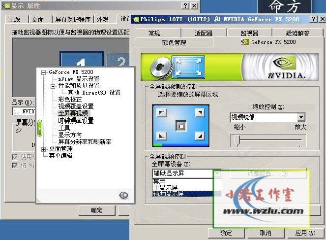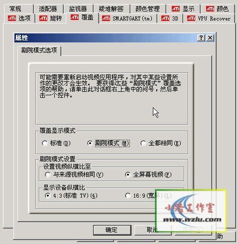 有的人说复制模式不好,因为我们需要两边作不同的事情,这边上网,那边看电视,互不影响。现在两边一样了,这就没有办法各干各的了。其实没有关系,你只要在显卡属性高级设置/全屏幕视频里面按照我的图示修改一下就可以了。