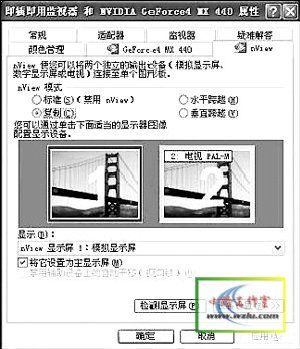 进入“nView”的选项菜单之后,你便可以在这里设置有关于多屏显示的相关选项。在“nView”模式中,“标准”便是禁用此项功能。“水平跨越”是指一个完整的画面分成水平的一半,然后分别从两个输出设备里显示出来。“复制”可以让画面在两个输出设备中同时显示出来。“垂直跨越”就是使画面分成垂直的一侧,分别从两个输出设备中显示出来。因为我们主要是想使画面可以在电视机中显示出来,所以这里选择“复制”选项。再在下面的“显示”下拉框中选中你喜欢的显示设备做为主显示屏。如果你要检测一下真实的显示效果,就点击“检测显示屏”来作检测。当然你如果要进行电视制式的选择可以选择右下角的“设备设置”,注意:Windows XP里面只有PAL制式。在这里面也可以进行屏幕调整和色彩校正。