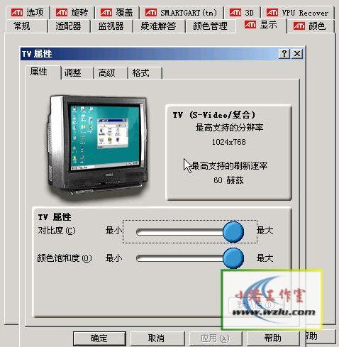 在进行显卡设置前,请先把电脑关闭,把S端子线分别接在电脑和电视的S端子,再打开电脑和电视(要切换到S端子视频输入)