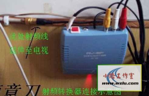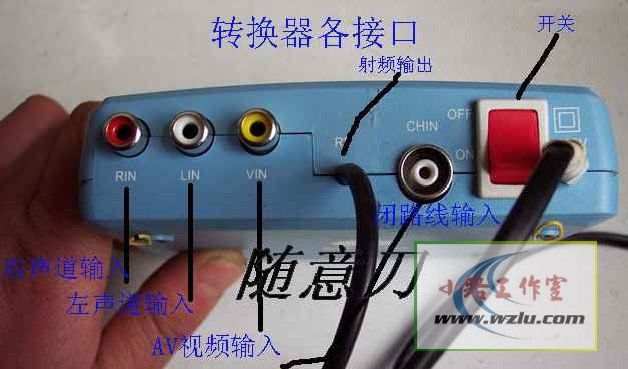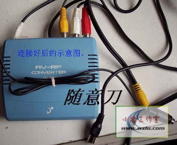 把S端子-AV扩展线连接到射频转换器的黄色插口上,左右声道信号插到对应的盐色插口上,射频转换器的射频输出插头插入电脑书房的闭路信号口内,连线就完毕.
