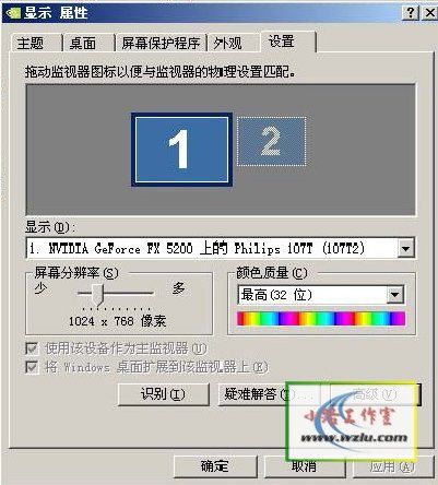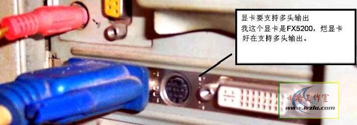说干就干,我的老显卡是GF2MX400的,老掉牙了,当然不支持多头输出。所以第一步就是请它退休,换了一个FX5200的显卡,虽然这款显卡也是老掉牙了,但是支持多头输出,这就达到我的要求了。再说了,好歹性能还是要比我的GF2强一些。我现在又不打游戏,一门心思赚钱,所以也就不贪求什么功能强大了。不求 好,只求 划算,这也算是咱们DIYer的一贯思维方式了。