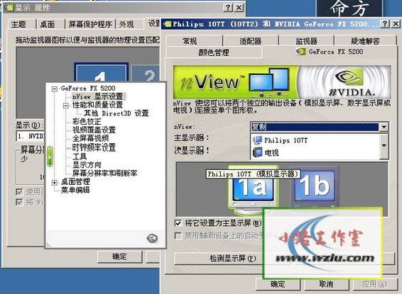 XP为例。在打开电脑以前,把电视机与显示器的TV-out口连接到一起,并且一定要打开电视机电源(否则电脑会因检测不到这个输出设备而禁止其相关选项)。打开电脑之后,在桌面上点击鼠标右键,在弹出的菜单中选择“属性”菜单。进入“显示”对话框之后,点击“设置”菜单里的“高级”按钮,你就可以看到“nView”的选项菜单了。