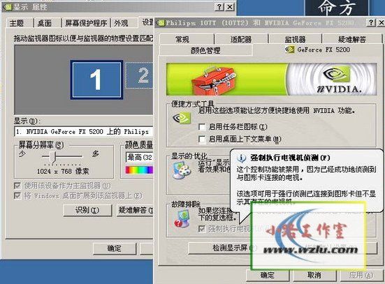 安装好了 新的驱动,确保所有硬件连线完好,视频转换器电源打开,电视已经开启。打开电脑进入系统在桌面上右键选择属性/设置/高级,进入显示属性高级设置面板。选择GeForce FX 5200项目卡,奇怪,根本没有nVIEW显示设置选项啊,不要着急,这是因为还没有检测到电视。我们到工具/故障排除/选择“强制执行电视检测”,系统就会立刻跳出一个对话框,点击确认后就会重新启动。