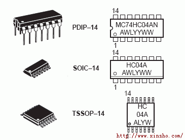 有三种基本封装,PDIP-14:塑料双列14脚直插式封装,SOIC-14:塑料双列14脚小型贴片封装,TSSOP-14:塑料双列14脚超小型贴片封装.