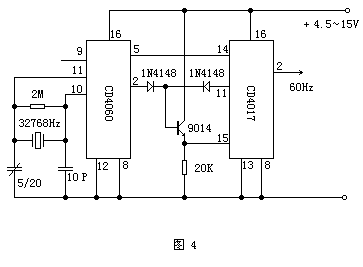 图5是由一片CD4060构成的60Hz的时基信号发生器。相对前几种是 为实用的时基信号电路。