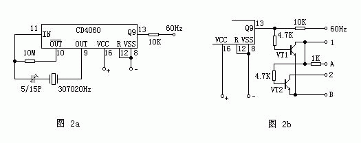 图2a是另一种60Hz脉冲发生电路。它由集成电路CD4060和谐振频率为30720Hz的晶振等元件组成。CD4060是14位二进制串行计数、分频器和振荡器。CD4060内部分为两部分,其中一部分是14级计数/分频器,其分频系数为16~16348;另一部分既可与外接电阻和电容构成RC振荡器,又可与外接晶体构成高精度的晶体振荡器。本电路采用外接30720Hz的晶振来组成晶体振荡器,其振荡信号经CD4060内部9次分频后,在Q9端输出准确的60Hz频率信号(30720÷29=60Hz)。