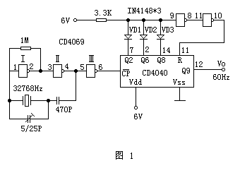 电路中,CD4069的门I和门II构成震荡频率为32768Hz的晶体振荡器。其输出经CD4069的门III整形后送至CD4040的 端。CD4040的输出由二极管VD1~VD3置成分频系数为21+25+29=546,经分频后在输出端Q9上便可输出一个60Hz的时钟信号供给数字钟集成电路。