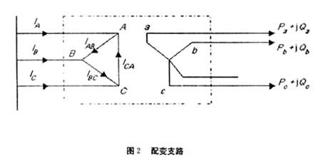 图1中的配变支路为“Δ-YO”接线的配电变压器,如图2所示。配变高压侧三相负荷电流由式(2)、(3)计算。