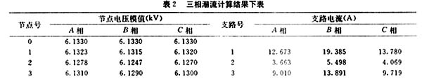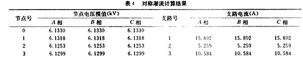 由表3可以看出三相潮流计算结果与实际测量值比较接近。电流的计算值与实测值 大偏差为3.62%, 小偏差为1.04%,平均偏差为3.28%。此偏差程度可以由状态估计得到校正。