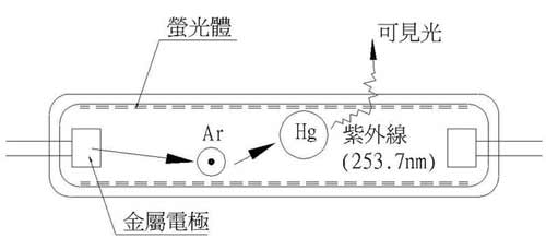 冷阴极灯管(图所示)在一玻璃管内封入隋性气体Ne+Ar混合气体,其中含有微量水银蒸气(数mg),并于玻璃内壁涂布萤光体,于二电极间加上一高压高频电场,则水银蒸气在此电场内被激发即产生释能发光效应,放出波长253.7nm的紫外线光,而内壁的萤光体原子则因紫外线激发而提升其能阶,当原子反回原低能阶时放射出可见光(此可见光波长由萤光体物质特性决定)。