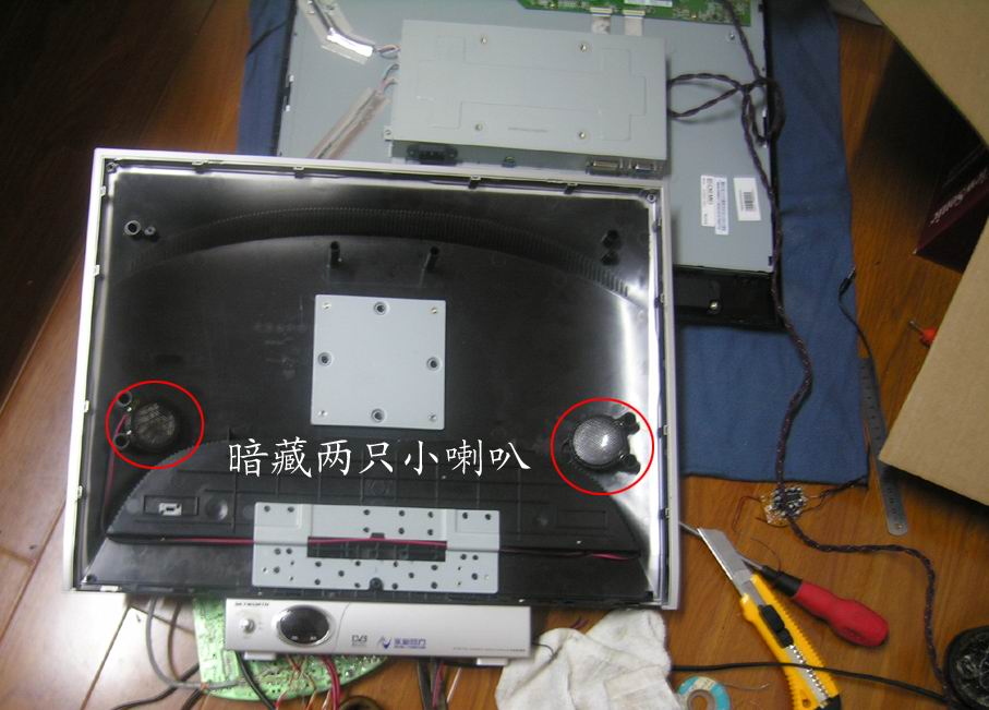 这款22寸之“优派”液晶显示器屏幕下方自带了两个小喇叭,可惜太小了,声量不够,只有找一个不碍事之地方再装两个少许大一点之扬声器,要不然就听不到声音了。见图5