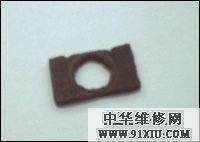 因为手机喇叭是圆形的,而笔记本原有的喇叭是长方形,长度方面没有问题,只不过宽度稍稍有点吃紧。用小刀将安置哑吧的位置稍稍扩大一点,但要注意不能挖得太大,让哑吧正好夹在里边不动弹 好。笔者将喇叭放进去将线路连接好以后发现怎么不出声音,但将喇叭取出来后就能发出声音,经过观察发现喇叭直接放进去后喇叭上的鼓膜直接就碰到了托腕的底部,因此造成喇叭不能正常工作,看来在喇叭与托腕底部还要留一点空间。找来一块废旧泡沫的鼠标垫,按照安置喇叭小槽的形状剪成长方形,然后再在中间挖上一个圆形小孔(图3),将它垫在喇叭与托腕底部中间(图4),这样既能使喇叭的鼓膜碰不到托腕底部,又给喇叭添加了减震。下边将喇叭固定好,固定喇叭就用原来的小夹子就可以了(图5),因为现在替代的喇叭要比以前的薄,所以需要将夹子折的弯度大一点,这样才能更好地固定喇叭。固定好喇叭后再将电路连接好,注意电线连接的地方要用胶布裹好,然后再将电线固定在面板上, 后将托腕再重新安装好,注意别忘记了将喇叭的插头给插上。