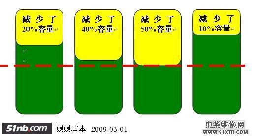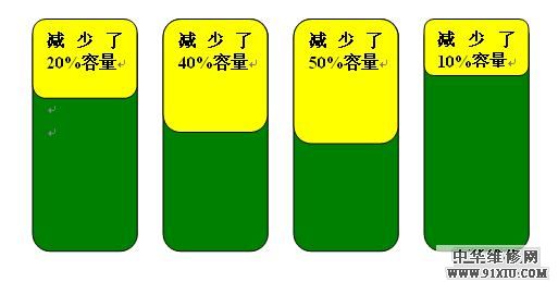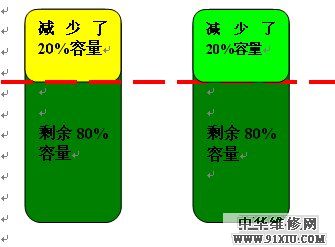 4、假设在校正2电池的过程中,由于大幅度放电,造成1号电芯出现电量进一步减少。主要是校正的时候还进行大负荷使用等等。按照“木桶原理”,电池的保护芯片按照 差的1号电芯进行平衡,这时的总容量是100W/H。这时实际上2号电芯的容量并没有明显损失,但是由于1号电芯的状态决定,2号电芯实际上处于永远不会充满的状态,除非1号电芯恢复正常,否则2号电芯永远不会恢复电量。