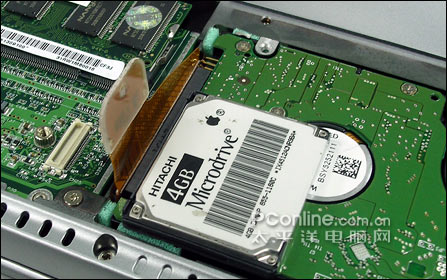 因为数据排线是与2.5寸盘按规格设计的,在接上MicroDrive的CF-miniIDE转接卡后有些反向,MicroDrive不能完全放到原硬盘的槽位中,因此接上主板后,不把盖板装上。如果有朋友有其它的机器想要玩此改装,可能要费点心事在如何安置好MicroDrive上面,让它可以很稳当放入机器中。