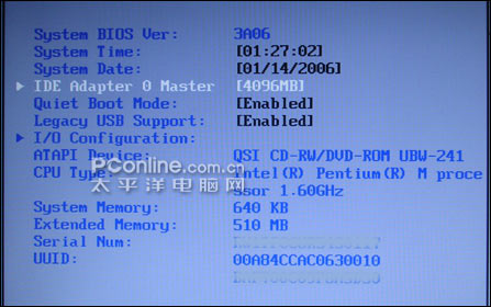 系统检测 完成改装的过程比较简单,完全只是一个替换过程,不需要进行任何线路、模具上的改动。安装好后,先要看看系统主板是不是可以正常识别出这块硬盘,F2进入BIOS: