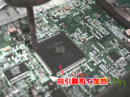 这个就是吹引脚芯片之步骤了,少点功夫或者走走神都有可能把芯片吹坏,向着四周均匀受热,大约3-5分钟之时候芯片就出来了。