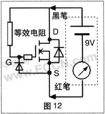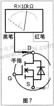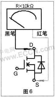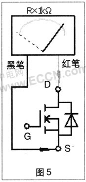 对于图4所示的。MOS管,因G-S间保护二极管的存在,万用表指针在接近零刻度位置后,将自动回复到电阻∞位置。