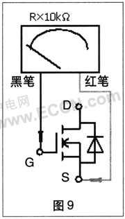 ①用红笔接源极S,黑笔接栅极G,对G-S之间的等效结电容进行充电,此时可以忽略万用表指针的轻微偏转,如图9所示。