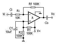 放大器电压放大倍数Av仅由外接电阻Ri、Rf决定:Av=-Rf/Ri。负号表示输出信号与输入信号相位相反。按图中所给数值,Av=-10。此电路输入电阻为Ri。一般情况下先取Ri与信号源内阻相等,然后根据要求的放大倍数在选定Rf。Co和Ci为耦合电容。