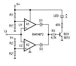 若选择U1>U2,则当输入电压Ui越出[U2,U1]区间范围时,LED点亮,这便是一个电压双限指示器。
