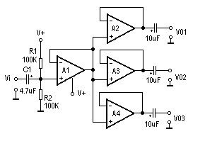 R1、R2组成1/2V 偏置,静态时A1输出端电压为1/2V ,故运放A2-A4输出端亦为1/2V ,通过输入输出电容的隔直作用,取出交流信号,形成三路分配输出。