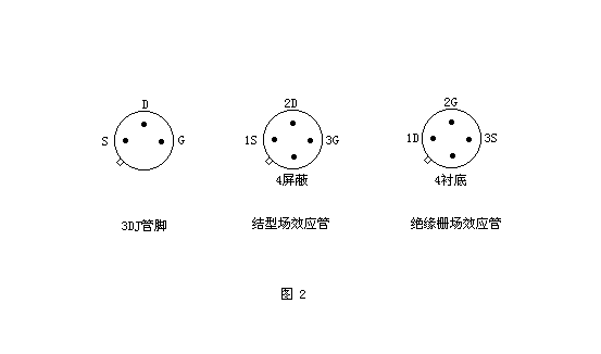 目前常用的结型场效应管和MOS型绝缘栅场效应管的管脚顺序如图2所示。