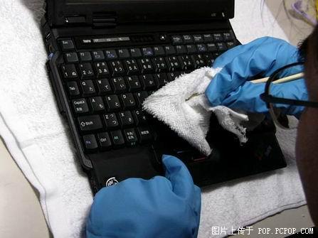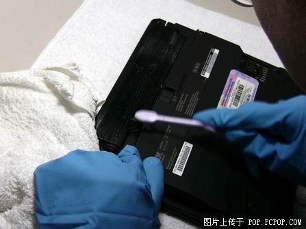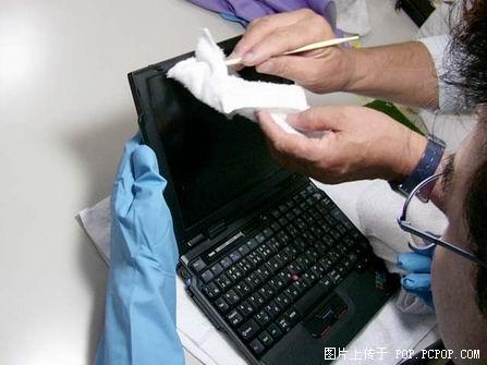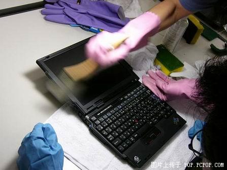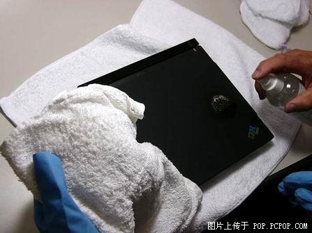 那么现在开始清洗ThinkPad。首先开始擦拭清洁。用蘸了清洁剂的毛巾小心的擦掉表面的污渍。顽固的污渍可以尝试有大量的清洁剂或者用封口剥离剂来擦。但是专家还提醒我们,必须要注意如果太用力去打磨同一处的话会导致外壳掉色。