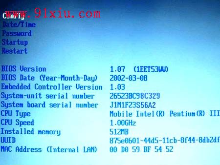 IBM在其T/A/X/I四大系列中采用的BIOS界面有点像PhoniexBIOS的标准界面。其BIOS设置主界面分为上下两块,下方是主要信息显示,也是验正行货与水货的重要证据。其中各项目意义如下。