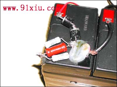 步骤三:安装、固定降压二极管和限流电阻。把P6A10和三只电阻的引脚尽量剪短一些,然后按上述方法与蓄电池组正极相焊接,(P6A10的负极应指向蓄电池正极,否则是充不进电的), 后用热熔胶把二极管和限流电阻固定在蓄电池上(图7)。要提醒各位的是,热熔胶的固定点应在P6A10或限流电阻的引脚上,如果固定点是P6A10或限流电阻本身,会因为充电时二极管和限流电阻散发的大量热量,使已凝固的热熔胶再次熔化而失去固定作用。