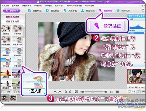 图3,进入数码暗房功能,使用“下雪效果”