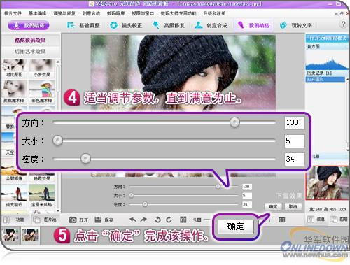 3. “下雪效果”可设置参数,但不设置直接默认也能得到不错的效果。如果你还想精益求精,还可以针对不同相片调整一下参数,以实现更高品质的下雪特效。确定后即可轻松实现下雪的初始景象(如图4)。