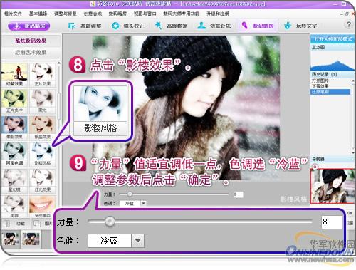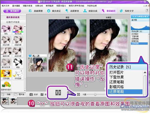 7. 再一次使用“还原笔刷”功能,将MM脸上过曝处擦回原图,让脸部恢复清晰质感。大功告成啦!如果你想对比 终效果或做 后调整,这时候可以使用彩影人性化的“YY”原图/效果图对比功能、“历史记录”功能(如图7),进行校对和修改。图8则给出 终成品图!