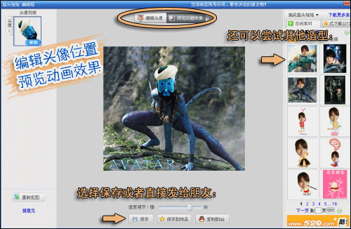 电影《阿凡达》这部全新概念作品自上映以来不但票房飙升,广大网友的P图热情也在持续高涨,各路明星皆被恶搞成阿凡达。看到很多用PS做的恶搞图片,小编自己手也痒痒。虽然不会PS,但借助“美图秀秀”软件的现成阿凡达素材,做个独特的动态阿凡达QQ表情,肯定很拉风。小编有预感,自己要开辟阿凡达QQ表情历史了……看看效果吧: