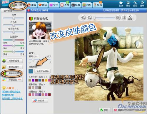 2、在“图片处理”下,利用“局部变色笔”来改变脸部皮肤的颜色,来迎合纳威人的蓝色皮肤。