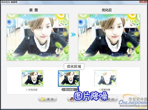 点击“自动优化”后会进入一个编辑框,大家可以看到有三个优化选项供选择,分别是补充光线、图片降噪和影楼效果。首先来看下“补充光线”的效果吧: