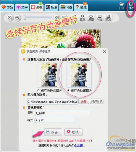 如果用动态边框来做下雪闪图, 后保存图片时,要注意选择保存为“动画图片”,这样才会有动态下雪的效果哦!如图6所示。