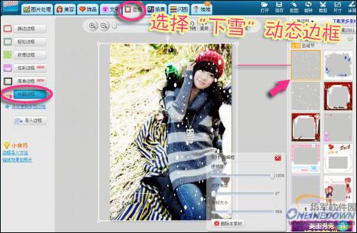 其实,用“美图秀秀”软件做下雪的效果,还可以用“动态边框”中的动态下雪边框来制作。只需选中,简单调节大小来覆盖图片即可。如图5所示。