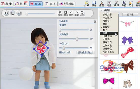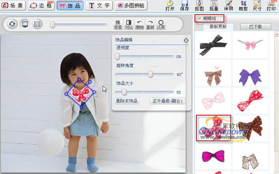 第二步:执行“饰品→蝴蝶结”命令,为宝宝添加一个可爱的蝴蝶结,如图03所示。