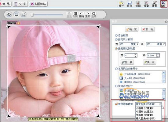 新版可牛影像采用了全新的“裁切”界面,不仅增强了按“高权比例裁剪”功能,还新增加了“使用圆角裁剪”功能。如图06所示,目前可牛支持“小圆角”“中圆角”“大圆角”“特大圆角”四类圆角裁切模式。