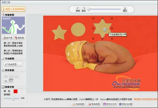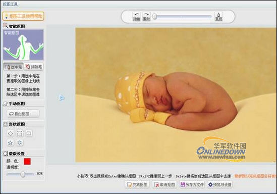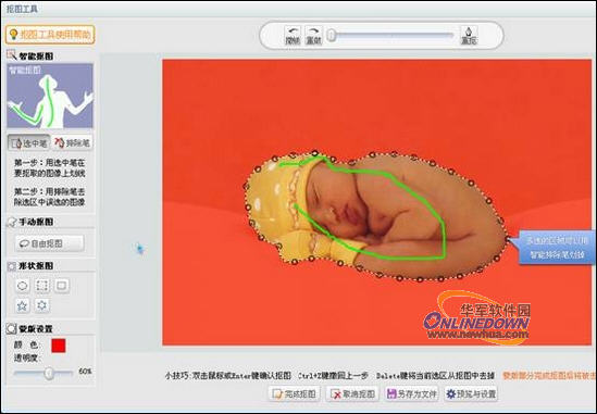 下面我们将通过一个实例来看看可牛新版的抠图功能在哪些方面得到了增强。首先选择智能抠图的“选中笔”,在Baby的身体上画道线,这时婴儿的身体就会被自动抠取出来。这就是我们熟悉的可牛影像的“智能抠图”功能,但是我们发现在选区的周围还多了一层红色的半透明的薄膜,嘿嘿,这就是可牛新版本增加的“蒙版”了。如果是用过PS的朋友,对蒙版一定不会陌生,有了它的帮助我们在抠取图像时将更加得心应手。