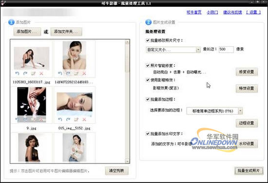 在图07中,我们看到通过可牛的“批量处理工具”我们可以批量修改照片尺寸、批量对照片进行修复、批量使用影楼特效、批量添加边框、批量添加水印文字。当我们设置好各个参数后,就可以点击“批量生成照片”按钮,进行批
