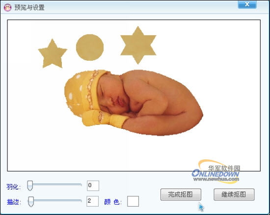 如果我们此时想要查看一下抠图后的效果,可以点击“预览与设置”按钮,进入如图04所示的“预览与设置”界面。在此,我们可以对选区进行“羽化”或者“描边”。笔者选择的是2像素的白色描边。如果你对抠图的效果比较满意的话,就可以点击“完成抠图”按钮结束抠图过程,如果你对抠图效果不满意则可以点击“继续抠图”按钮,继续践作。