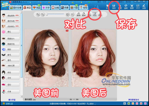 六、完成“染发”后就大功告成啦!现在选择“对比”看看前后效果对比,满意的话选择“保存”保存图片即可。