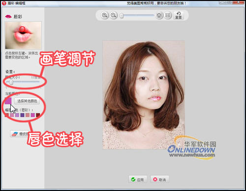 三、处理完眼睛部分,就可以来修饰嘴唇啦。同样点击“美容”菜单里的“唇彩”功能,在“唇彩 编辑框”内选择喜欢的唇色并调节画笔的大小直接涂抹唇部即可。