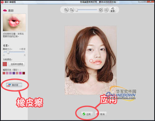 温馨提示:唇彩涂出去了或者涂错可用橡皮擦修改哦,下面染发上色时也是一样。完成后选择应用。