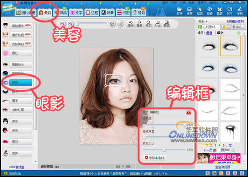 二、先来点击“美容”菜单,在左侧的界面列表中选择“眼影”功能并在右侧挑选喜欢的眼影,让照片里的自己看起来更加精神。记得要在编辑框内调节眼影的大小、位置、透明度,使其自然贴合眼睛哦。
