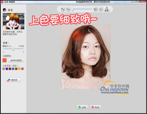 五、接着就是我们的重头戏,染发啦!选择美容菜单下“染发”功能,这一步其实和和“唇彩”的践作一样,只要选择好颜色用画笔涂抹头发就行了,不过关键是上色的时候要仔细哦。